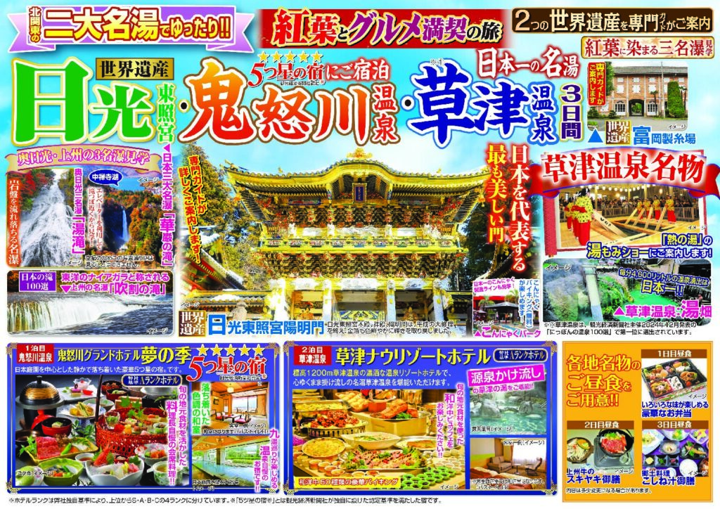 日光東照宮・鬼怒川温泉・草津温泉3日間