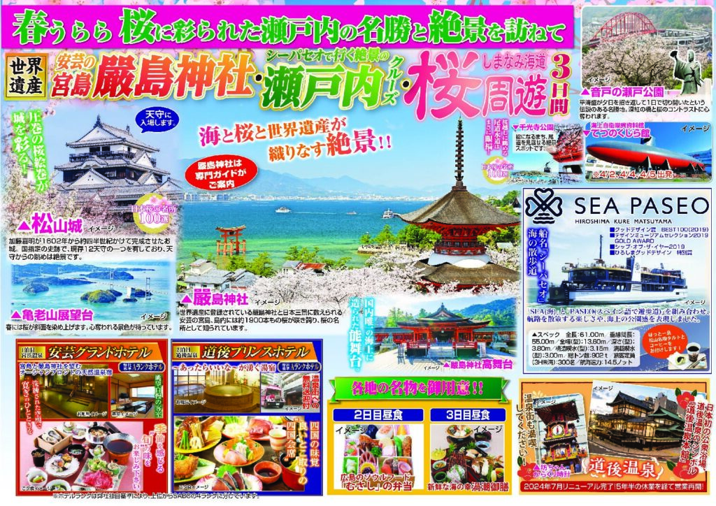 安芸の宮島厳島神社・シーパセオで行く絶景の瀬戸内クルーズ・しまなみ海道桜周遊3日間