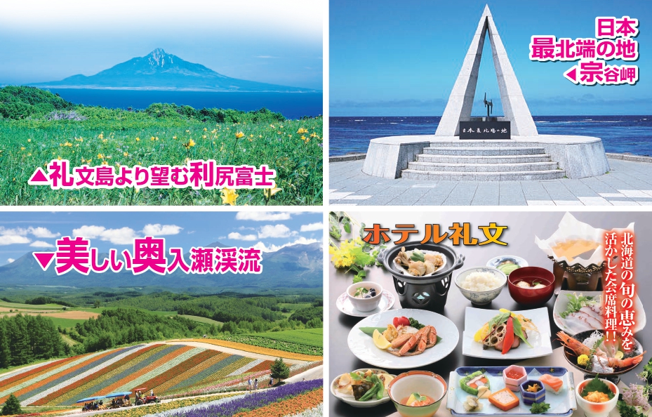 「礼文島と稚内は温泉施設のあるお宿にご宿泊」「北海道の海と大地の味覚をご堪能」