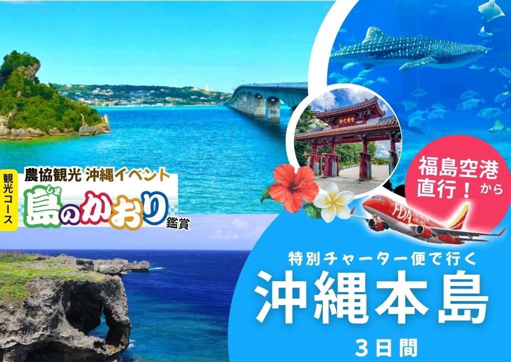 冬でも温暖な沖縄へ、FDAチャーター便で福島空港から乗り換えなしでひとっ飛び!観光付きの「島のかおり」コースでは、絶景と文化を満喫!沖縄美ら海水族館や古宇利大橋、万座毛、首里城などの名所を巡り、夜は農協観光沖縄イベント「島のかおり」(エイサー等の伝統芸能)を鑑賞。航空+宿泊のみのフリープランもございます。